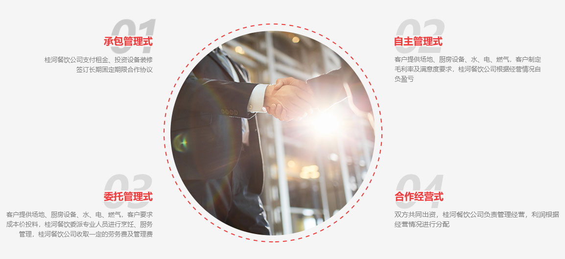 山东桂河餐饮有限公司是一家专业承包大中小企业、医院、学校食堂、膳食托管、营养配餐、蔬菜粮油配送、厨房设计、物业管理服务、会议接待、客房服务、食堂保洁等一体化的后勤管理服务公司,长期致力于团餐服务外包和美食广场发展事业。